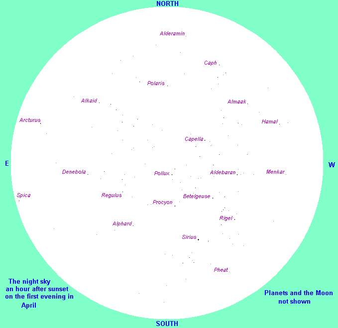 Your sky map for the month of AprilSpecifically, this is the view of a clear sky from a latitude of 37N. Star-gazers farther north, such as in Minneapolis, Chicago and most of Europe, will have more of the northern sky visible and the southern sky will be obscured by the horizon. Vice versa for those who are farther south. The stars will not change position relative to each other, however, throughout the month, the Moon and planets will wander, so they are not shown. Only objects of magnitude 4.0 and brighter are displayed. Here's a reverse color image of the map that will be easier on your printer. | ![]() |