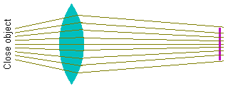 | When we bring an object closer to our face, the object appears larger but we cannot focus on it. Notice that the rays from a nearby object are NOT parallel when they strike the eye lens. Our eye lens cannot produce a focused image on our retina so a nearby image may be closer, and therefore bigger on our retina, but we cannot see it well. |